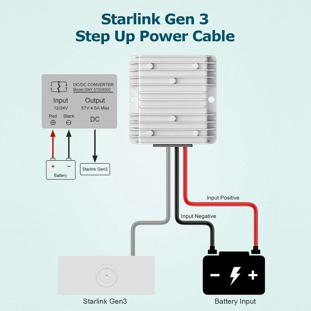 Забезпечте живлення вашого Starlink Gen 3 будь-де за допомогою цього високоефективного перетворювача напруги 12 В/24 В на 57 В. Розроблений спеціально для аксесуарів Starlink Gen 3, він забезпечує стабільний вихід 57 В/4,5 А (до 256 Вт) від вашого автомобіля, акумулятора або сонячної системи. Вдосконалена схема підвищення напруги запобігає падінню напруги та забезпечує надійне супутникове з'єднання навіть під час тривалої роботи. Завдяки водонепроникному алюмінієвому корпусу та міцній проводці 18AWG, він створений для автономного використання в кемперах, вантажівках та на суднах.