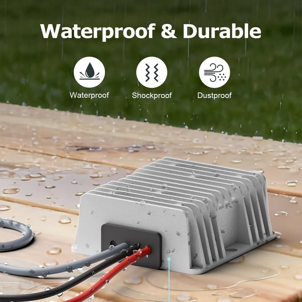 - Просте підключення: Два вхідні дроти 14AWG (червоний = позитивний, чорний = негативний) підключаються безпосередньо до автомобільних акумуляторів, систем постійного струму або сонячних генераторів.